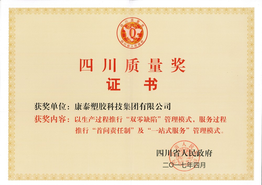作為“四川質(zhì)量獎(jiǎng)”的獲得者,康泰塑膠科技集團(tuán)從創(chuàng)立以來,一直致力于對(duì)產(chǎn)品的研發(fā)升級(jí)和質(zhì)量把控,不斷滿足客戶的需求。在康泰,公司建立了一整套質(zhì)量管控體系,以“圍繞全球顧客、不斷改善,追求產(chǎn)品零缺陷”的質(zhì)量方針,貫徹“產(chǎn)品如人品”的質(zhì)量理念,全面覆蓋ISO9001、ISO14001、OHSAS18001三體系,實(shí)施全員、全面質(zhì)量管理,通過導(dǎo)入PDCA循環(huán)管理和QCC體系,嚴(yán)格質(zhì)檢把控?!皥?jiān)持不合格原料不進(jìn)廠”,從源頭杜絕不合格產(chǎn)品的出現(xiàn);“堅(jiān)持不合格的產(chǎn)品不出廠”,從生產(chǎn)流程上杜絕不合格產(chǎn)品的出現(xiàn),確保產(chǎn)品各項(xiàng)質(zhì)量指標(biāo)均達(dá)到或優(yōu)于國(guó)家標(biāo)準(zhǔn),讓用戶滿意。