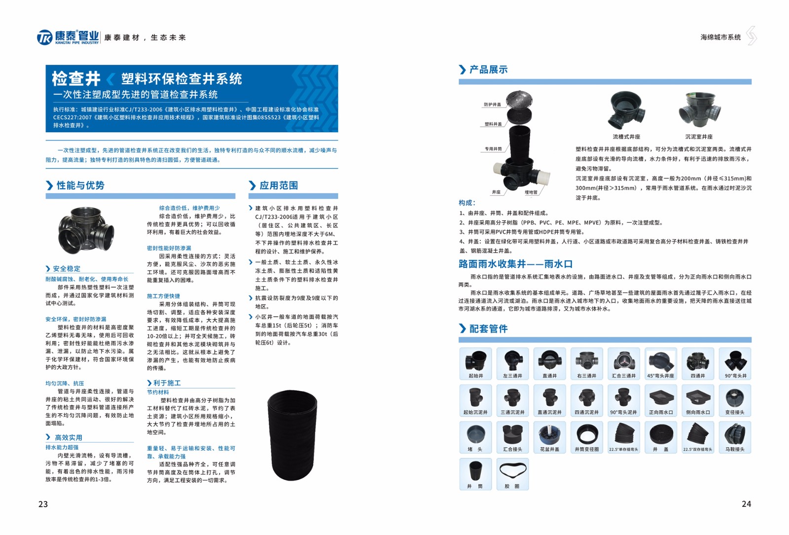 康泰海綿城市系統(tǒng)用主要產(chǎn)品有普通型、加強型、抗紫外光型、抗老化型、抗震型、抗腐蝕型、防結(jié)垢型多功能MPP雨水集成模塊,高強度 PVC,抗震性PE,開槽式、打孔式滲排管,一次性注塑成行塑料檢查井及配件;排水管有MPVE雙壁波紋管、PE鋼帶增強纏繞管、PE雙壁波紋管、PVC雙壁波紋管,PVC實壁管、PE實壁管、PVC-M實壁管,產(chǎn)品規(guī)格從110mm-2000mm,產(chǎn)品品類達(dá)到200多種,同時具備快速開發(fā)新產(chǎn)品的資質(zhì)與能力,滿足不同環(huán)境條件的需要。