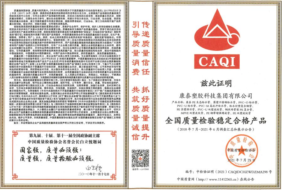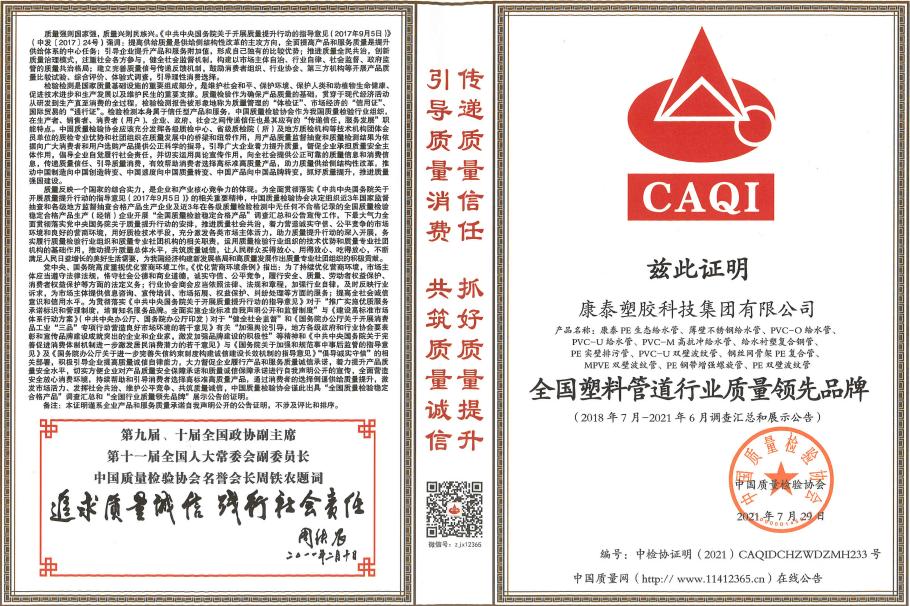 近日,康泰榮獲由中國(guó)質(zhì)量檢驗(yàn)協(xié)會(huì)頒發(fā)的“全國(guó)塑料管道行業(yè)質(zhì)量領(lǐng)先品牌”、“全國(guó)塑料管道行業(yè)質(zhì)量領(lǐng)先企業(yè)”、“全國(guó)質(zhì)量檢驗(yàn)穩(wěn)定合格產(chǎn)品”稱號(hào)。