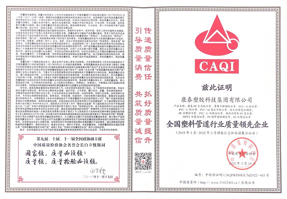 近日,憑借優(yōu)質(zhì)的產(chǎn)品、完善的服務(wù)、良好的口碑,康泰集團(tuán)一舉榮獲中國質(zhì)量檢驗(yàn)協(xié)會“全國塑料管道行業(yè)質(zhì)量領(lǐng)先企業(yè)”、“全國產(chǎn)品和服務(wù)質(zhì)量誠信領(lǐng)先品牌”兩項(xiàng)榮譽(yù)。