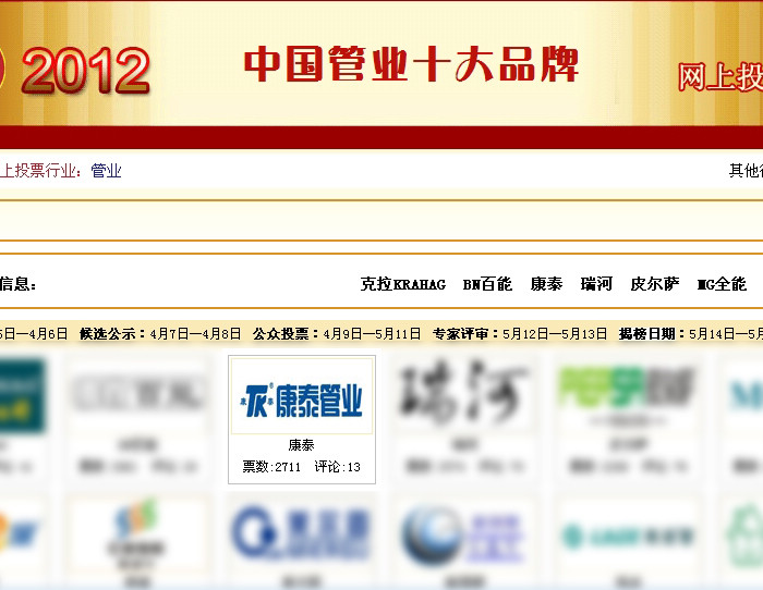 圖為康泰塑膠科技集團(tuán)獲2012年中國管業(yè)十大品牌評(píng)選網(wǎng)頁