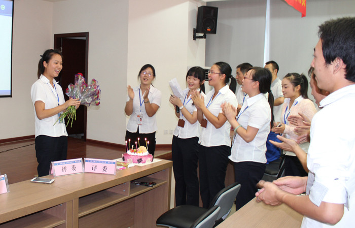 演講比賽結(jié)束后,9月員工生日會(huì)隆重舉行。很多9月生日的員工因?yàn)楣ぷ髟蛭茨苓_(dá)到現(xiàn)場(chǎng),隨著“祝你生日快樂(lè)”熟悉的旋律響起,一段9月生日員工的PPT向大家展示了9月壽星們?cè)诠ぷ鲘徫簧系木耧L(fēng)貌,而來(lái)自采供中心的何瑤代表他們接受了大家的鮮花與祝福。